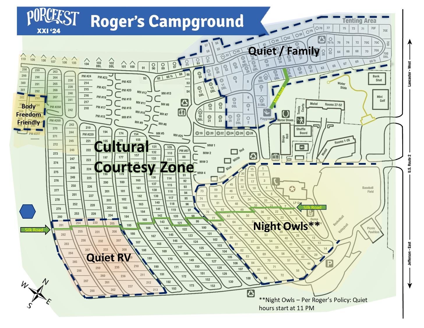 Not sure which campsite to select? The map below specifies zoning for PorcFest XXII. Simply let Roger’s know which zone you’d like to be in!