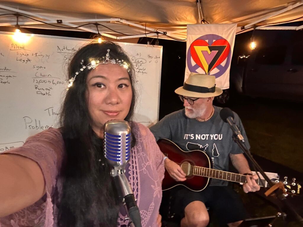 Consider becoming a HUB organizer and hosting various acts (more info on creating a HUB can be found HERE.) Your HUB can be a space where people can gather, share tunes, swap stories, and create memories through sound by bonding around a jam session. Invite fellow campers to join in—musicians, dancers, or those who just want to listen. A “Hub” can be as simple or elaborate as you like, but the key is to enhance the campground experience for everyone. By setting up your own music spot, you’ll contribute to the lively energy that makes this event unforgettable. So, grab your instruments, bring out your speakers, put on your dancing shoes or just bring your love for music. Taking initiative to create new spaces through individual, human action is part of the PorcFest philosophy and we hope you join us at to experience it and contribute to it.